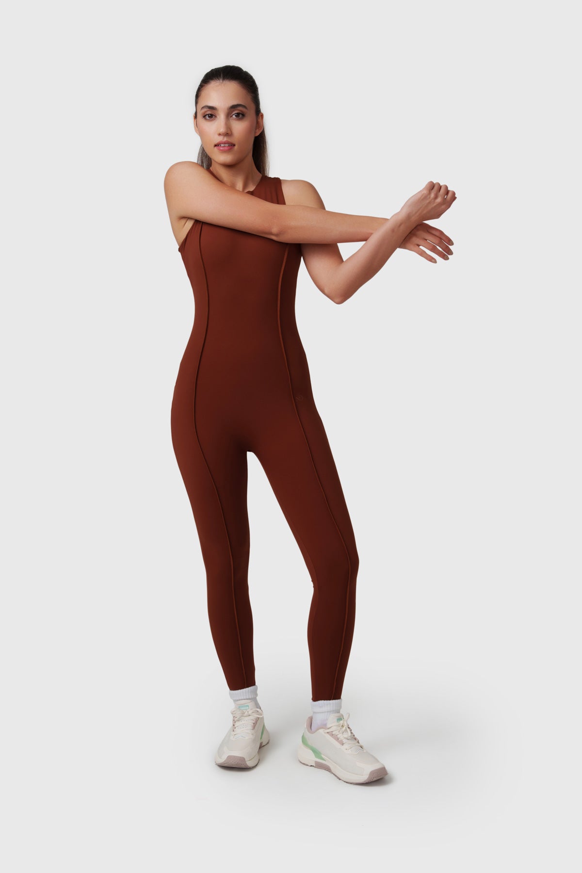 NALA Brown Jumpsuit, Women’s Activewear UAE, Eco-friendly Jumpsuit, Sustainable Activewear Dubai, Pilates Outfit UAE, Yoga Jumpsuit for Women, Luxury Gymwear UAE, NALA Dubai Activewear