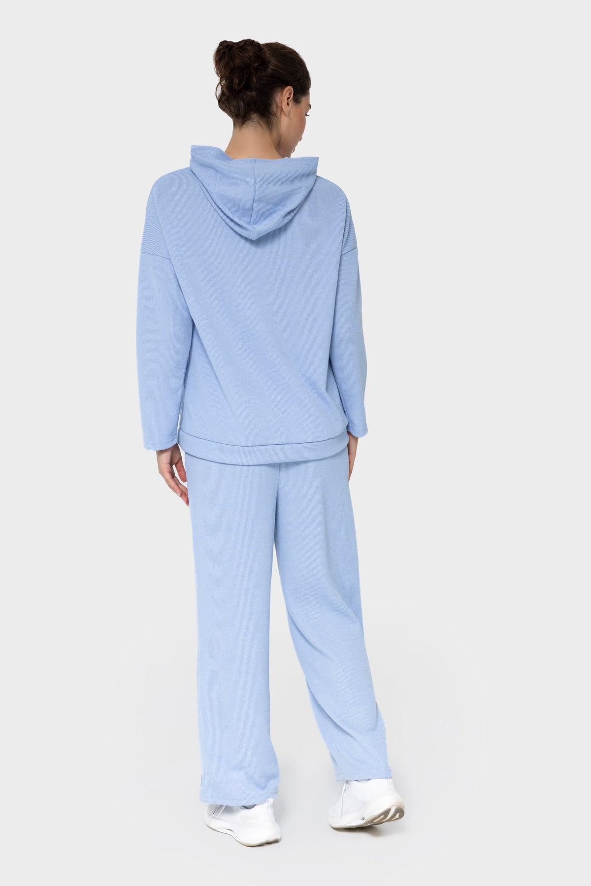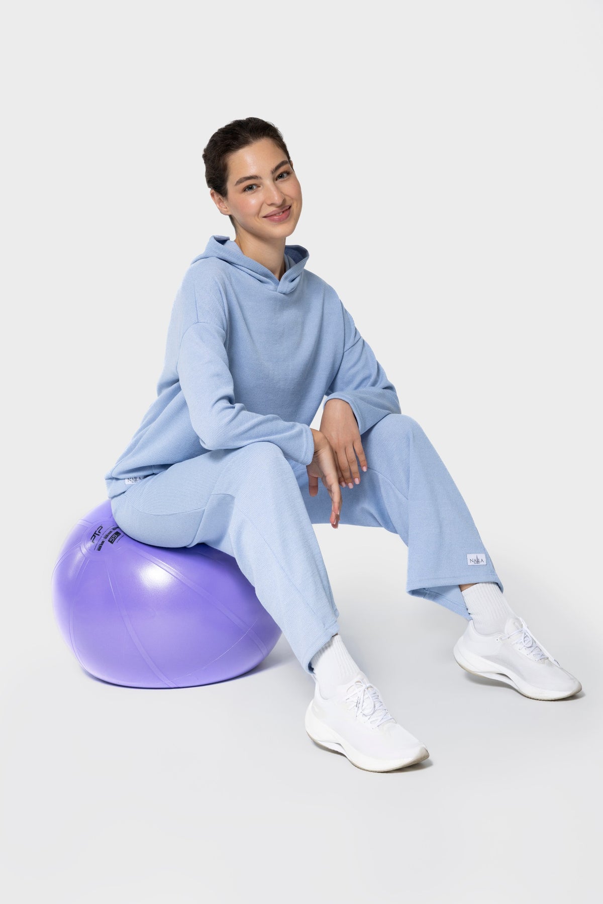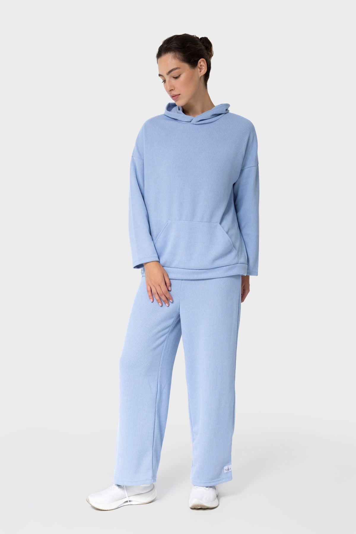 sky blue loungewear set, women’s knit hoodie, autumn casual wear UAE, modest fashion set Dubai, NALA Dubai hoodie, workout leisurewear for women, modest activewear, hooded knit set, blue tracksuit UAE, NALA gym outfit
